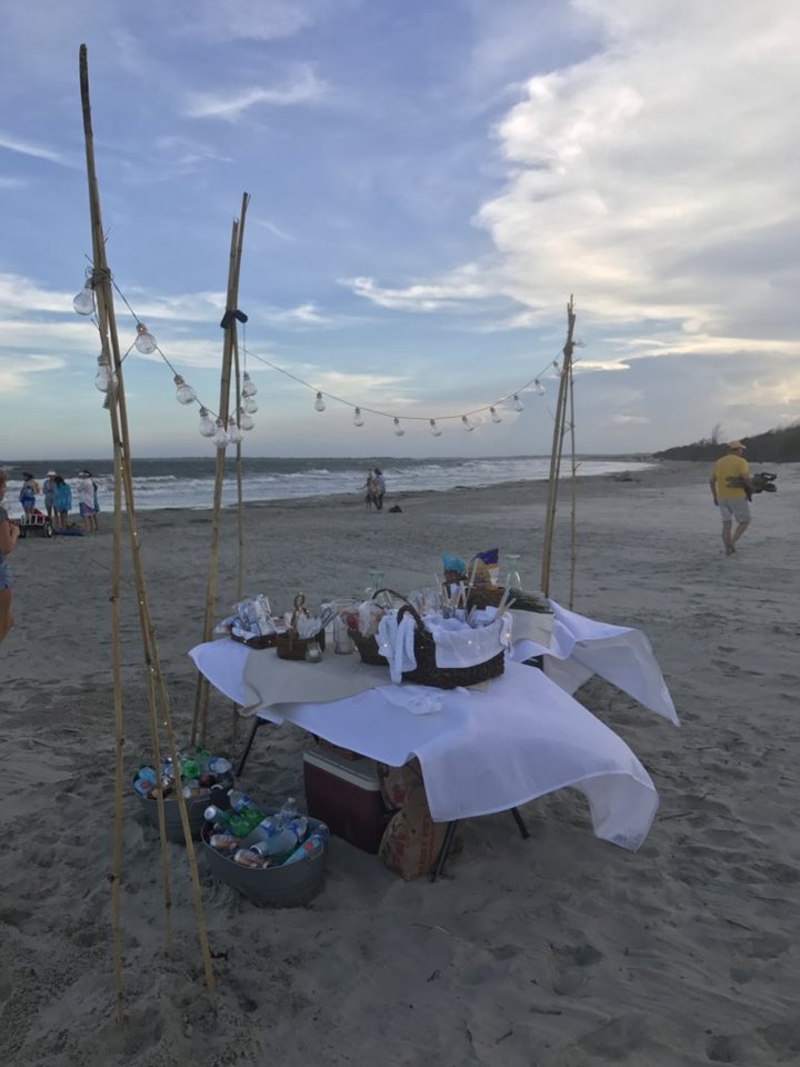 We placed our tables and string light setup at the top of the beach, close to the public access path but still on open sand. This gave us a clear view of the ocean while avoiding any issues with the incoming tide.