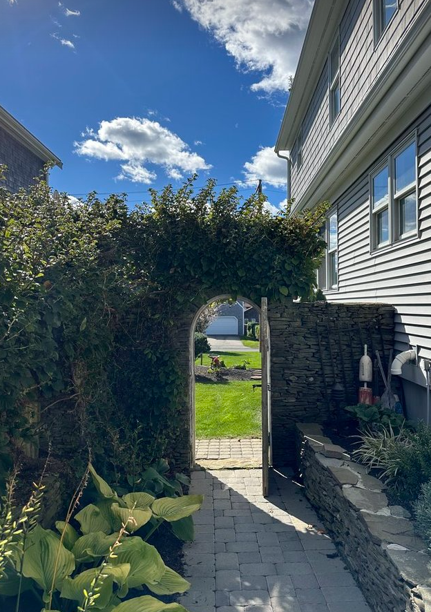 From the arbor, a path of smooth grey pavers leads into the main sitting area. These pavers are key to achieving a clean, structured feel that contrasts beautifully with the organic shapes of surrounding plants. Grey tones also reflect the natural hues of Rhode Island’s rocky shoreline, grounding your space in a coastal aesthetic. When selecting materials, aim for those that mimic local stone to maintain a regional feel.