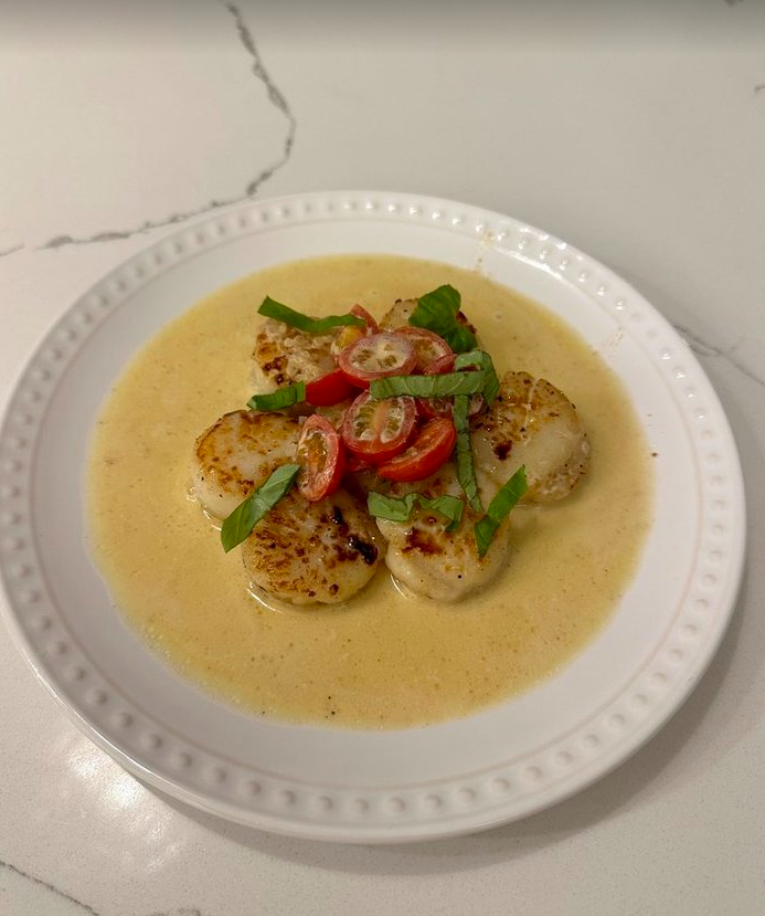 - Plate the scallops, spoon the sauce on top, and garnish with basil threads. Serve warm.